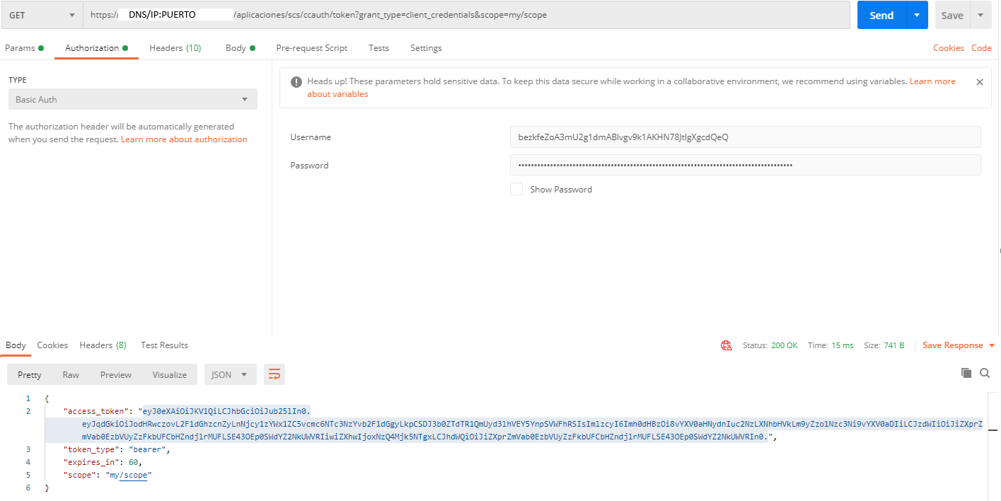 Para consumir la URL "https://DNS/IP:PUERTO:57776/oauth2/token" deberemos realizar un GET con los siguientes parámetros de configuración: