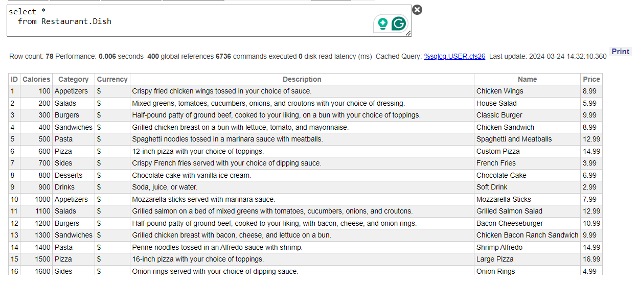 Property Name As%String;Property Description As%String(MAXLEN = 1000);Property Category As%String;Property Price As%Float;Property Currency As%String;Property Calories As%Integer;