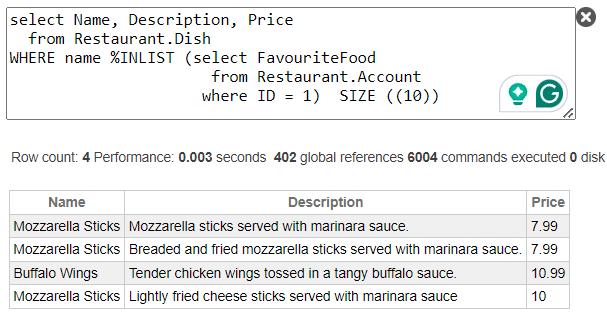 scalar-expression %INLIST list [SIZE ((nn))]Por ejemplo, ahora queremos ver qué platos de los favoritos de nuestros clientes tenemos en el menú: