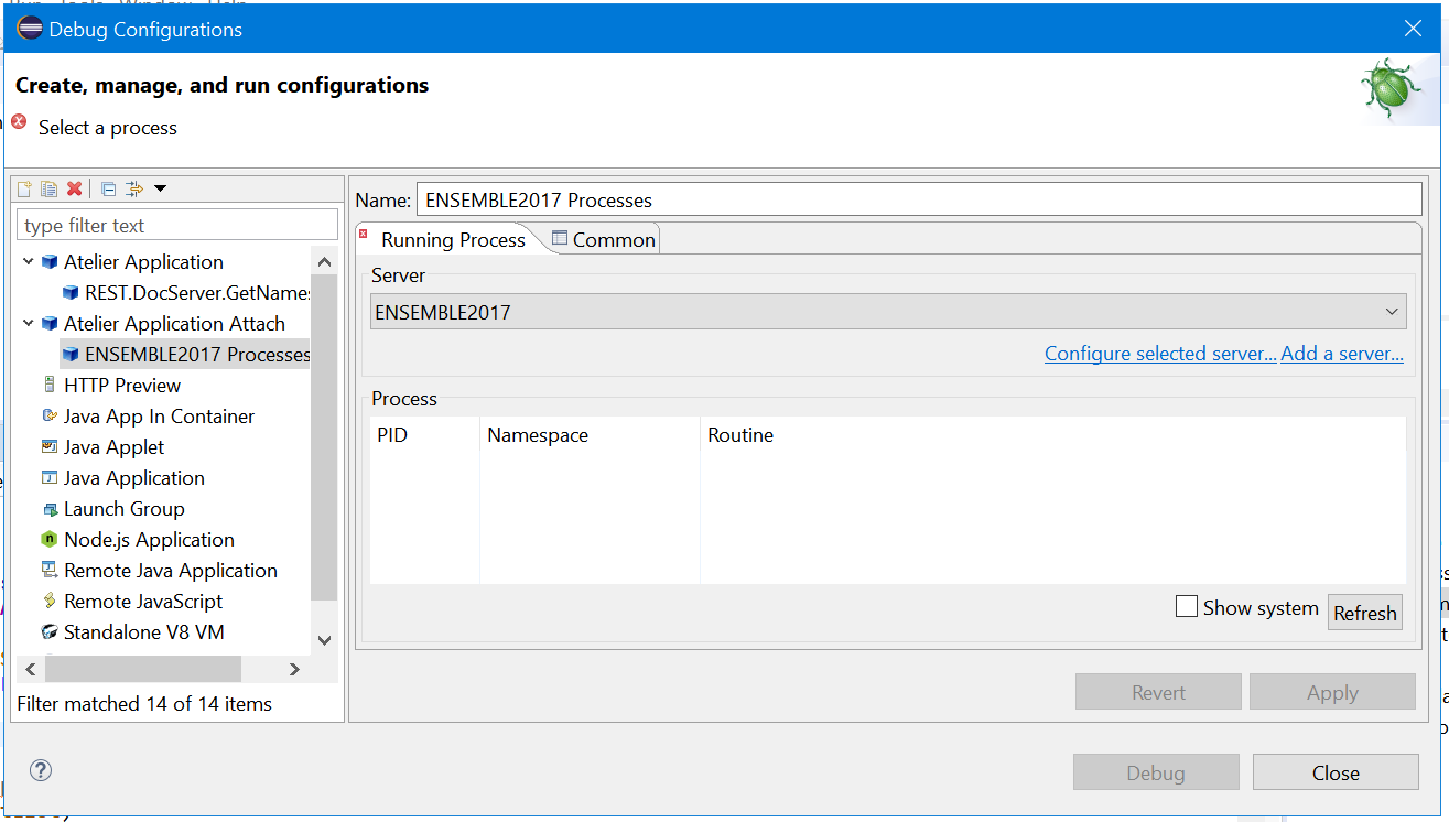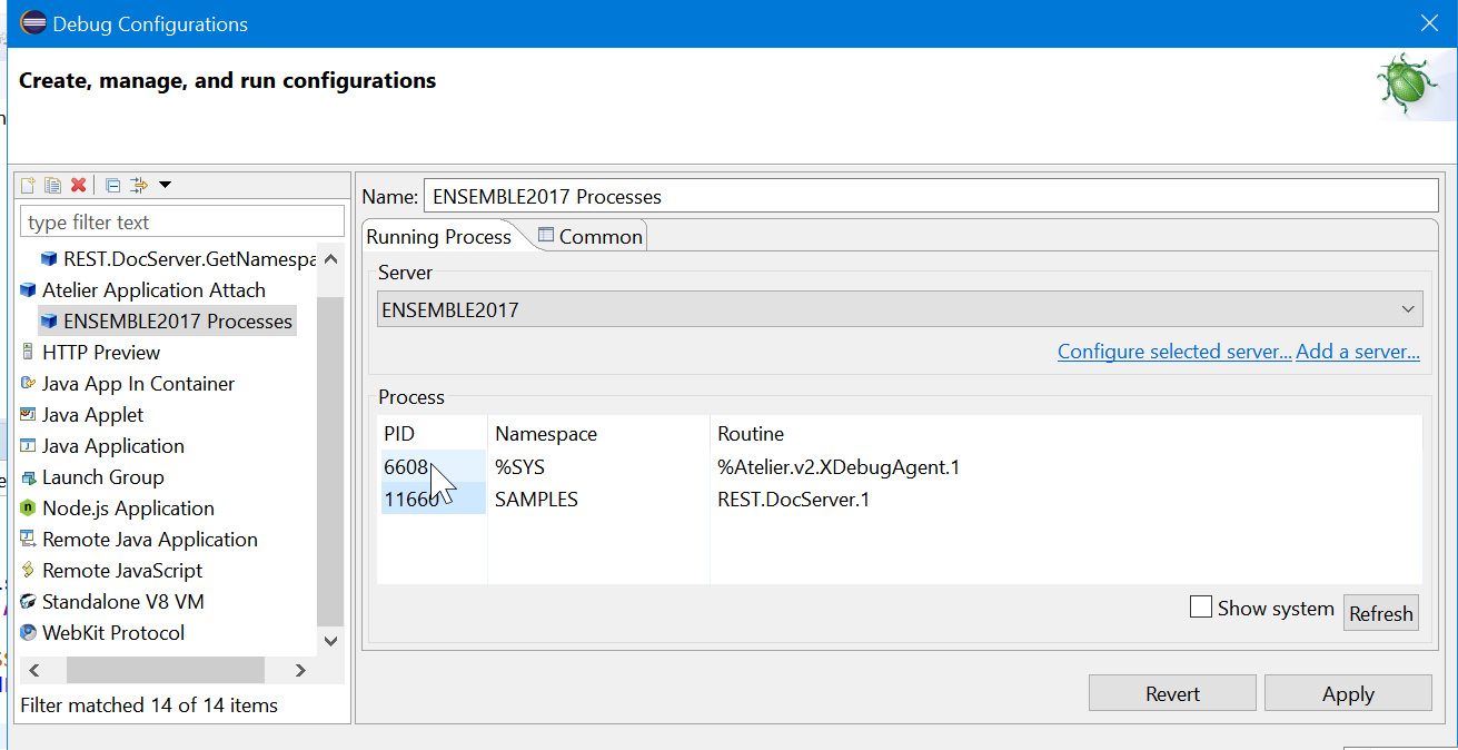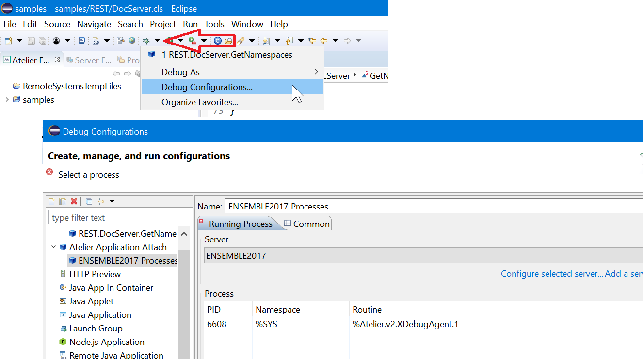 13 - En Atelier, haz clic en Run->Debug Configuration->Application Atelier Attach y elige el proceso de la lista que configuraste
