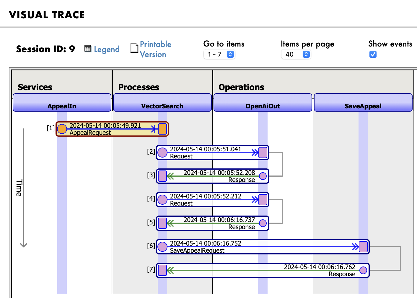 La interacción de todos los elementos mencionados se muestra claramente en el seguimiento/rastreo visual. Aquí el seguimiento visual de la toma de un contrato de seguro, su división en vectores y el almacenamiento de los vectores en una base de datos: