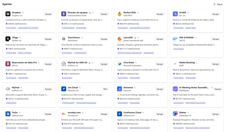 Date una vuelta por los agentes predefinidos; seguramente encontrarás alguno muy interesante de alguna aplicación que ya estés utilizando, como Jira o Confluence. Estos agentes son versiones especializadas de Copilot, diseñadas para interactuar con aplicaciones o servicios específicos. Cada agente está configurado para: