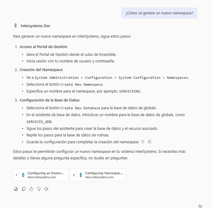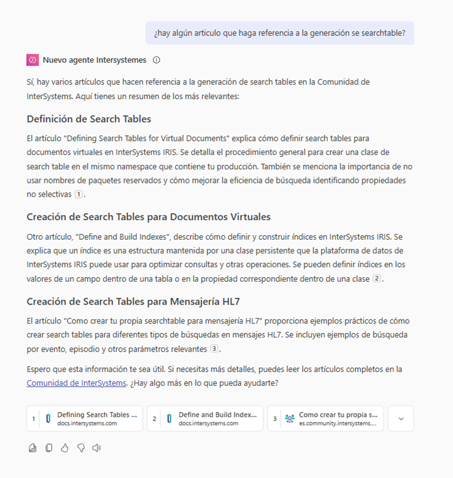A partir de aquí, ya tienes tu agente para buscar en la documentación de Intersystems.