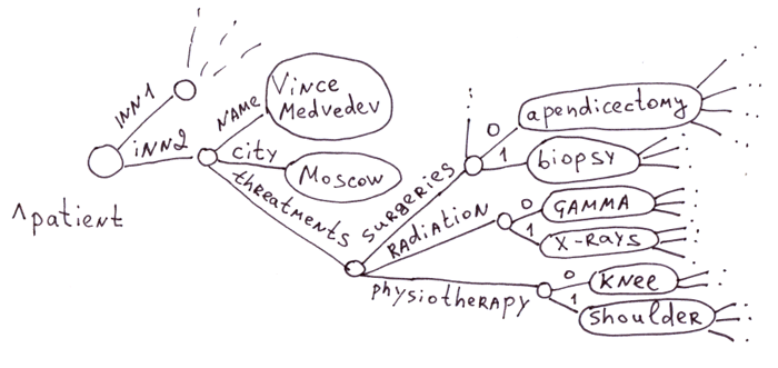 Imagine una base de datos SQL compuesta de las siguientes tablas: "Paciente" ~ 100.000 campos, "Medicación" 100.000 campos, "Terapia" 100.000 campos, "Complicaciones" 100.000 campos y así sucesivamente. Como alternativa, puede crear una base de datos con miles de tablas, cada una para un tipo de paciente en particular (¡y también pueden superponerse!), tratamiento, medicamentos y miles de tablas para las relaciones entre estas tablas.