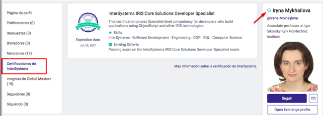 Y la información sobre su certificación estará disponible en su página de perfil, en el apartado "Certificaciones de InterSystems":