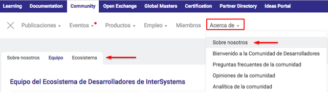 Y otra pestaña "Ecosistema" con todos los portales y los recursos a disposición del desarrollador de InterSystems: