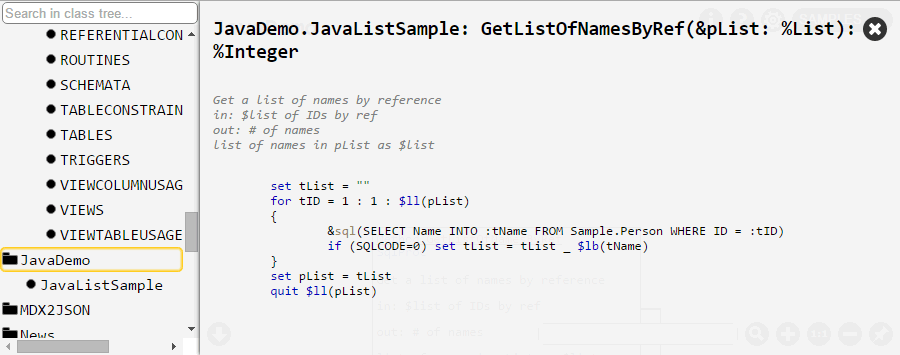 Métodos: puede hacer clic sobre cualquiera de los métodos para ver su código fuente. La sintaxis de COS se resaltará,