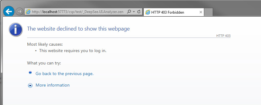 La primera forma es ver un mensaje de Forbidden o HTTP 403 Forbidden desde tu navegador cuando se intenta acceder a una página del Portal de administración de DeepSee. Diferentes navegadores y diferentes versiones de Caché presentarán este error de diferentes maneras. Aquí puedes ver la misma URL solicitada en Firefox y en Internet Explorer: